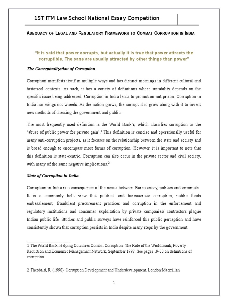 Corruption has become a serious problem in India, essay on corruption in india there is no sector in the country where corruption is in control. It is spread in every corner of the countrywhich is the biggest drawback in the economic, social development of the country. However, to end the problem of corruption, the government had demonetization the currency, endorsed many strict rules and regulations against black marketing. In this article Essay on Corruption in Indiawe had provided the various essays in different word limits, which you can use as per your need:. When a person goes against the judicial system for the sake of selfishness and for the benefit of himself or else commits immoral acts for the purpose of harming someone, he is called corruption.